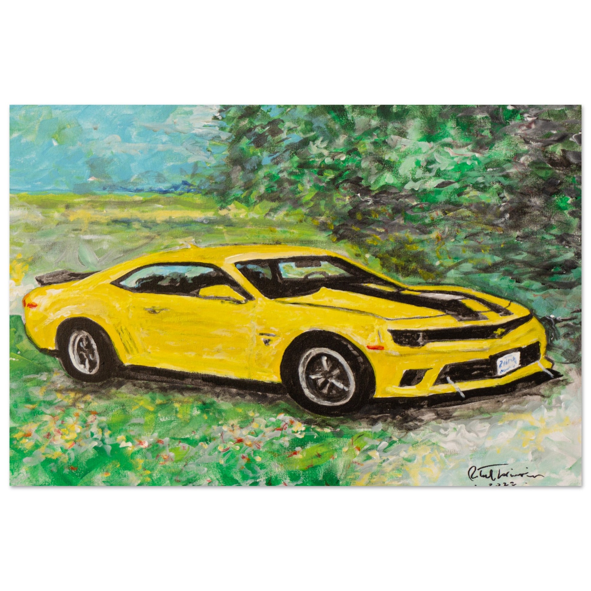 Experience the thrill of automotive art with our premium matte poster, inspired by Robert Lariviere's original artwork. This striking scene features a vibrant yellow 5th generation Camaro 2SS, proudly parked amidst a picturesque countryside setting. Ideal for car enthusiasts and those who appreciate the power of speed and design, this piece adds energy and excitement to any space.