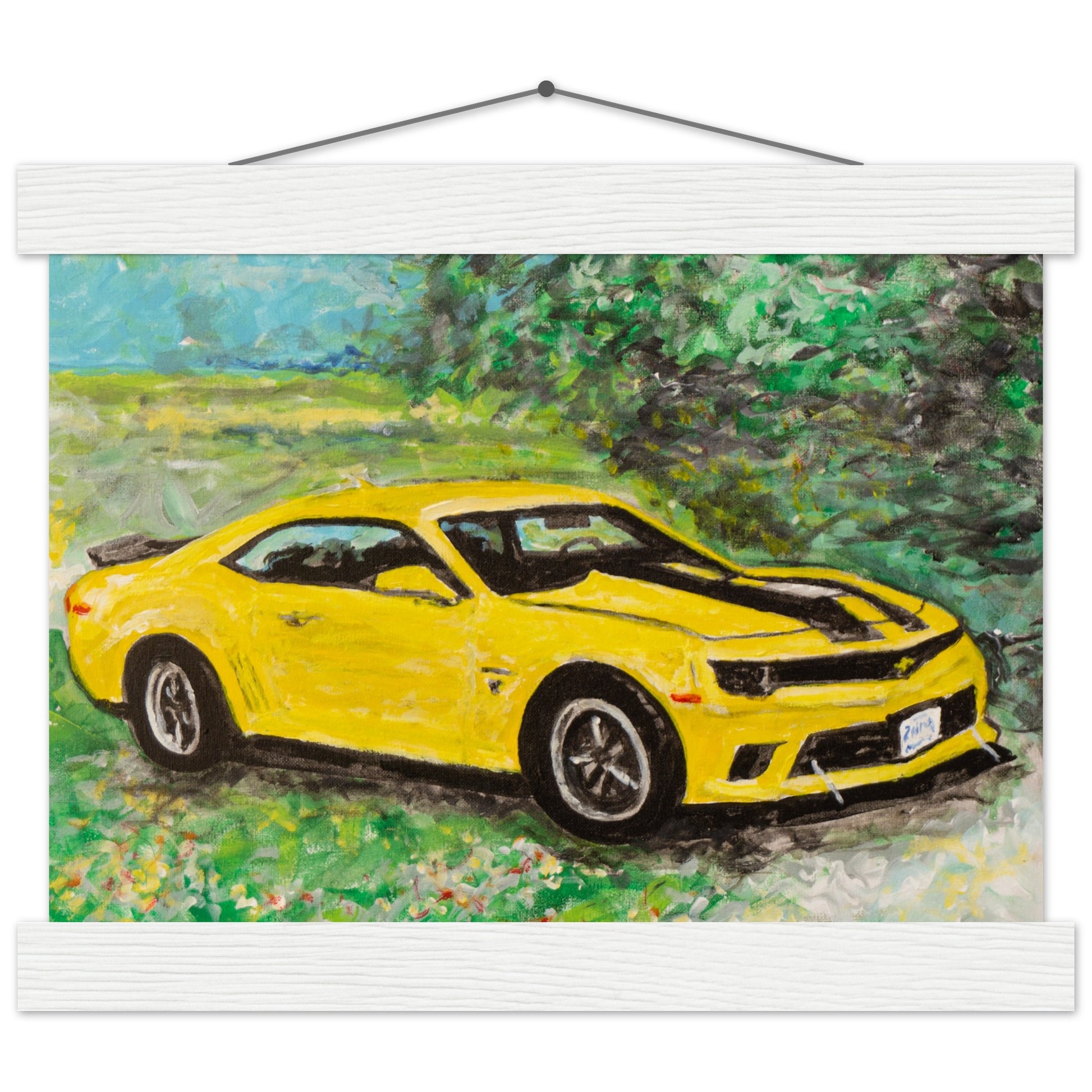 Experience the thrill of automotive art with our premium matte poster, inspired by Robert Lariviere's original artwork. This striking scene features a vibrant yellow 5th generation Camaro 2SS, proudly parked amidst a picturesque countryside setting. Ideal for car enthusiasts and those who appreciate the power of speed and design, this piece adds energy and excitement to any space.