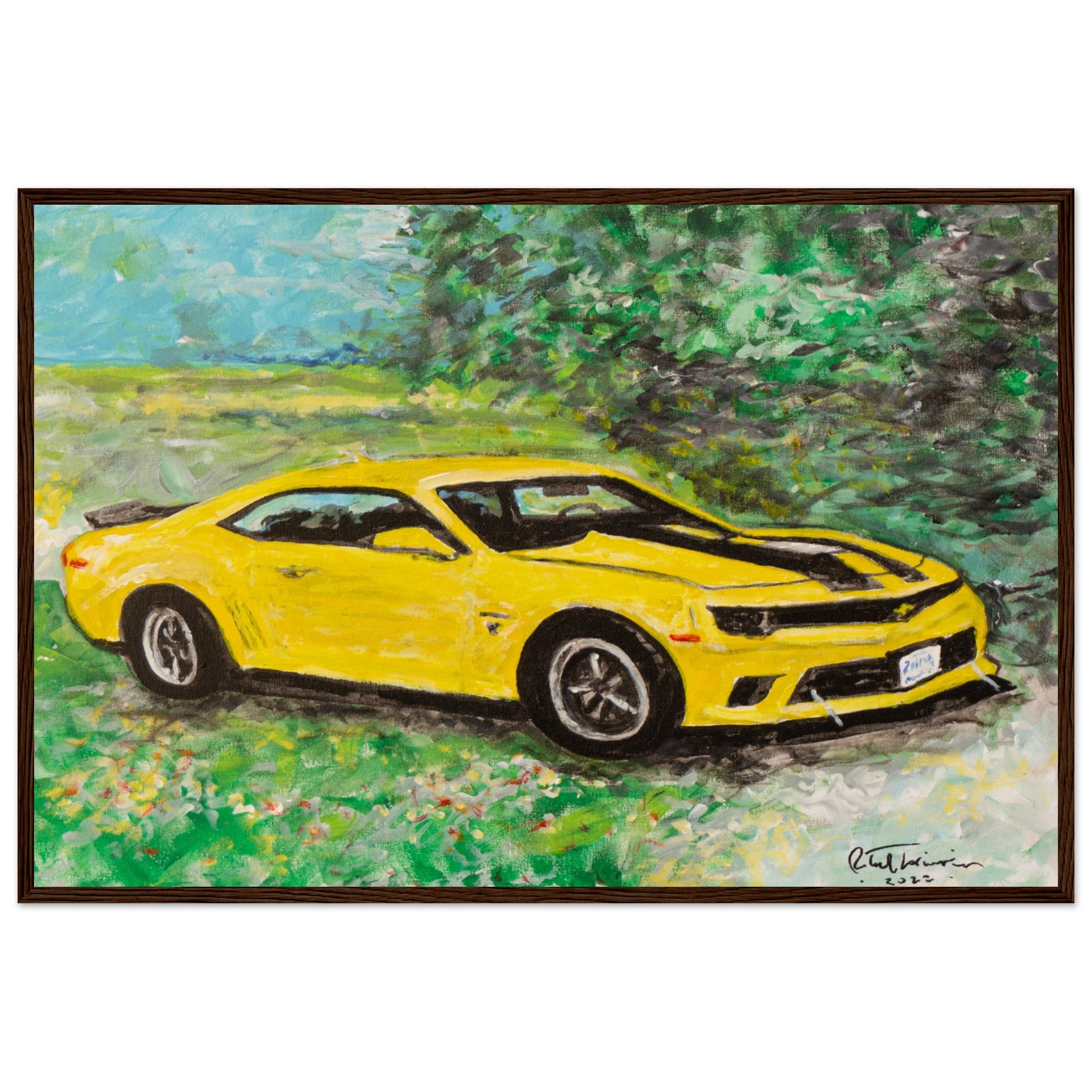 Experience the thrill of automotive art with our premium matte poster, inspired by Robert Lariviere's original artwork. This striking scene features a vibrant yellow 5th generation Camaro 2SS, proudly parked amidst a picturesque countryside setting. Ideal for car enthusiasts and those who appreciate the power of speed and design, this piece adds energy and excitement to any space.